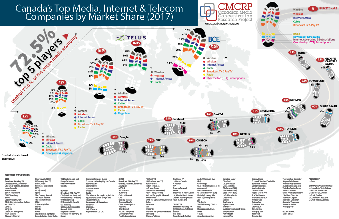 POSTER: 2017 Mapping Canada’s Top Telecoms, Internet & Media Companies by Revenue and Market Share (UPDATED) Download the PDF here.